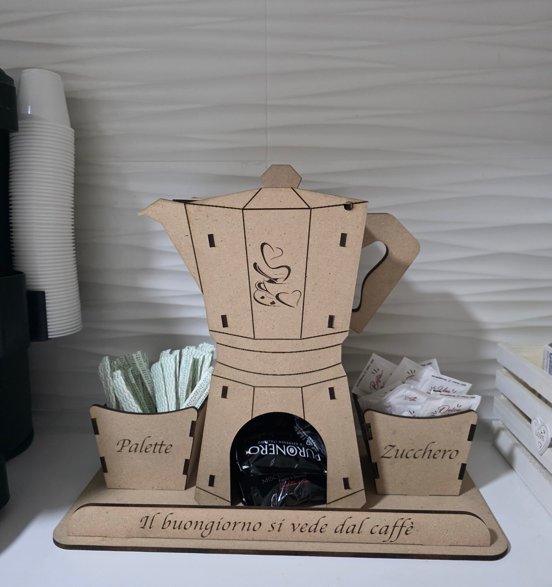 Porta un tocco di calore e originalità nella tua cucina o angolo caffè con questo elegante porta zucchero e palette a forma di moka, realizzato in MDF e inciso a laser. Perfetto per bar, uffici o ambienti domestici, è dotato di scomparti dedicati e una simpatica frase che può essere personalizzata con il testo che preferisci.