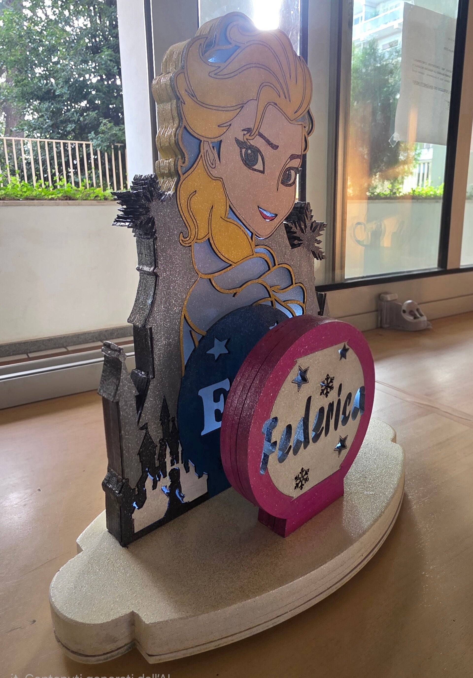 Lampada artigianale in legno con Elsa, con nome personalizzabile sul fronte. Realizzata con taglio e incisione laser di precisione e rifinita a mano, per un risultato curato e unico.